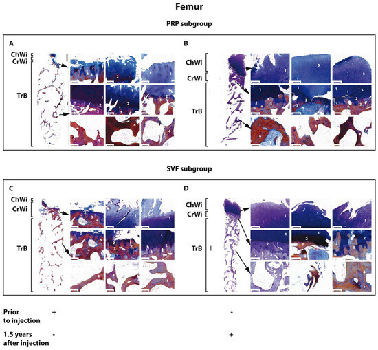 Morphology of osteochondral specimens from the femur before (A,C) and 18 months after (B,D) HTO in the PRP (A,B) and SVF (C,D) subgroups of patients with KOA. Tr.B, trabecular bone; Cr.Wi, subchondral plate height; Ch.Wi, articular cartilage thickness; 1, hyaline cartilage; 2, mineralized cartilage; 3, subchondral bone plate; 4, bone trabecula; and 5, fibrous cartilage. Osteochondral specimen magnification level, 5× Scale bar = 200 μm.