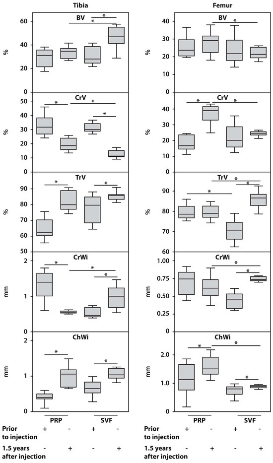 The intergroup analyses conducted before surgery revealed no differences in bone volume (BV) and subchondral (cortical) bone volume (Cr.V) in the medial condyles of the femur and tibia (p > 0.05) between patients with KOA treated with PRP (n = 10) or SVF (n = 10) after HTO surgery (Table 1 and Table S1). However, trabecular bone volume (Tr.V) was significantly higher in the tibia of SVF-treated patients but lower in the femur of the same patients compared with the PRP subgroup before surgery. Additionally, significantly higher subchondral (cortical) plate height (Cr.Wi) was noted in the medial condyles of the femur and tibia in PRP-treated patients compared with SVF-treated subjects. Articular cartilage thickness (Ch.Wi) was significantly higher in the medial tibial condyle of SVF-treated patients; however, the same subjects demonstrated lower cartilage thickness in the femoral medial condyles.