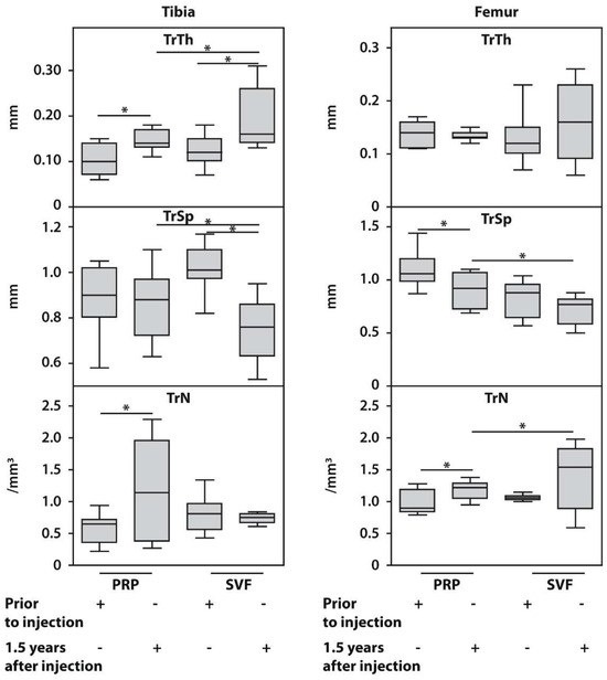 In this regard, a significant increase in trabecular thickness at the tibial condyle after both post-treatments might represent a positive outcome of these therapeutic approaches. Additionally, as patients with OA commonly have increased intertrabecular space compared with healthy subjects [15,45], a significant decrease in intertrabecular space in response to SVF post-treatment at the tibial medial condyle and after PRP post-injection at the femoral site could be considered a positive result of the corresponding treatments in the examined patients with KOA. Moreover, a significantly lower intertrabecular space at the femoral site in response to SVF post-treatment indicates the higher efficacy of this post-treatment compared with PRP post-injection.