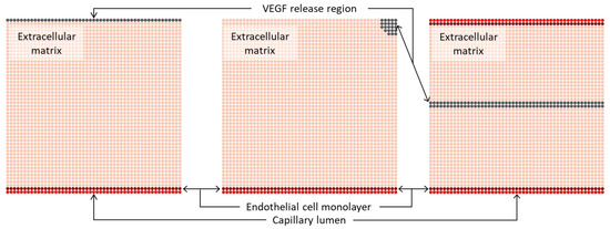 The simulation of capillary network growth was conducted within 5 × 5 mm2 square domain, discretised with 2601 nodes to create a regular nodal mesh. In this study, three different initial domain geometries were defined, as illustrated in Figure 1, aligning with approaches from previous works [16,30,34]. In the performed simulations, the location of the capillary lumen, the endothelial cell monolayer and the VEGF release region change in each model under analysis.