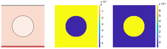Mechanical loading application in a circular region in the middle of the domain (Left, color labels are related to Figure 1) and the respectively obtained compression (middle) and traction (right) colourmaps (Scale bar in MPa: ×10−3. The scale bar used is linear).