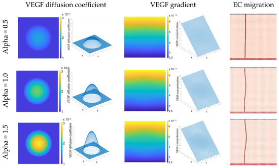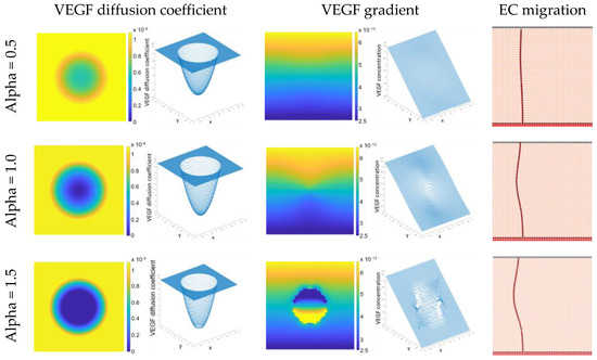In our model, endothelial cell migration is regulated by the chemical diffusion of VEGF. Accordingly, the influence of compression on the VEGF diffusion coefficient was analysed and, consequently, in the VEGF gradient. Figure 4 demonstrates that compression leads to a reduction in the VEGF diffusion coefficient. Notably, this reduction is directly proportional to the increment in the alpha parameter value. This reduction, in turn, impacts the VEGF concentration within the region where compression is applied. As a consequence of this change, endothelial cell migration is directed away from the area subjected to compression.