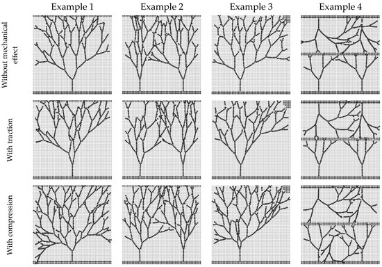 Upon analysing Figure 7, it becomes evident that compression significantly enhances angiogenesis. In Example 1, compression resulted in a 68% increase in vessel length and a 70% increase in the number of branches. Similarly, in Example 2, compression led to a 15% increase in vessel length and a 31% increase in the number of branches. In Example 3, compression increased vessel length by 19% and the number of branches by 45%. Finally, in Example 4, compression brought about an 18% increase in vessel length and a 35% increase in the number of branches. The quantitative results obtained for traction are similar to those obtained for the situation without mechanical stimulation.