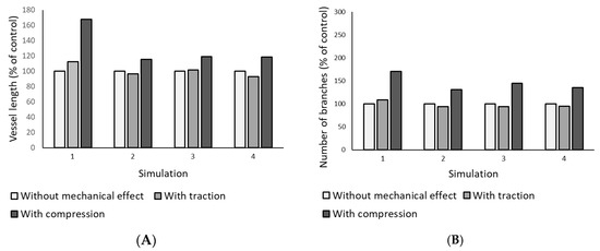 Quantification of vessel length (A) and number of branches (B) for each performed simulation domain. The results are presented as a percentage of the control.