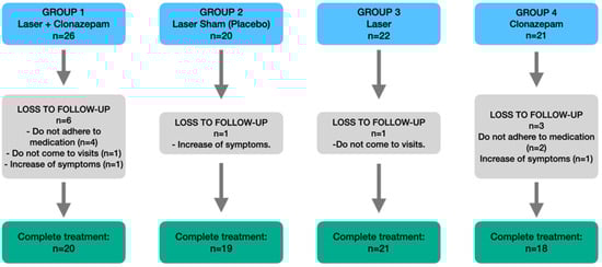 The patients were divided into groups as follows: group 1 (n = 20) (patients subjected to low-level diode laser treatment [Helbo® Theralite Laser 3D Pocket Probe] once a week for one month and with clonazepam 0.25 mg once every 24 h for one month); group 2 (n = 19) (patients treated with the same laser once a week for one month but without activating the laser tip, as a placebo); group 3 (n = 21) (patients treated only with the laser once a week for one month); and group 4 (n = 18) (patients treated only with clonazepam 0.25 mg once every 24 h for one month). The patients were unaware of the different groups on which the study was based.