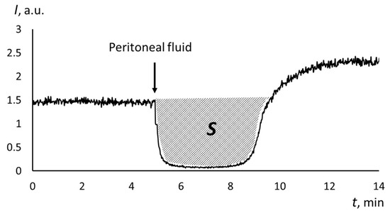 Chemiluminescence was recorded at 37 °C in a system containing a free radical generator 2,2′-azo-bis(2-amidinopropane) dihydrochloride (ABAP) and luminol in a 100 mM phosphate buffer solution (PBS, pH 7.4) (all reagents from Sigma-Aldrich, St. Louis, MO, USA). The luminescence was recorded until the plateau was reached, then a 10 μL aliquot of peritoneal fluid diluted 10 times with PBS was added. The luminescence was recorded until a new plateau was reached. With the PowerGraph 3.0 software (DISoft, Moscow, Russia), the luminescence suppression area S was calculated, which is proportional to the antioxidant capacity of water-soluble antioxidants (Figure 1). The reference limits for blood plasma were determined previously (n = 98) as 195–405 a.u. [36]. A decrease in S corresponds to oxidative stress.