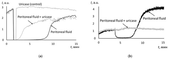 To clarify the contribution of uric acid to the antioxidant capacity, we used a test with uricase. A 5 mg portion of uricase (Uricase from Bacilius fastidiosus, #94310, 13.4 U/mg, Sigma, St. Louis, MO, USA) was dissolved in 500 μL of phosphate buffer solution (100 mM, pH 7.4). A uricase working solution was prepared by diluting the stock solution 100 times with PBS. By definition, 1 U of uricase activity oxidizes 1 mmol of uric acid at pH 9.1 and 37 °C. Although the optimal is pH 9.2, uricase activity remains high at pH 7.4 [37]. The upper reference limit for uric acid in blood is 420 µmol/L. Taking into account a hematocrit of 50%, the concentration can be taken for ease of calculation as 1000 µmol/L (1 mmol/L). The cuvette contains 1 μL of plasma that corresponds to 1 nmol of uric acid, which requires 1 nanounits of uricase for oxidation. Experimentally, we found the conditions for complete suppression of antioxidant capacity in blood plasma. Taking into account possible enzyme inhibition and other factors, we used an excess of enzyme activity of 1.3 × 107 times. To sum, a 10 μL aliquot of uricase working solution (a final concentration of 0.0134 U/mL that corresponds to 0.0134 U in the cuvette) was added to the cuvette containing 10 μL of peritoneal fluid diluted 10 times with PBS, shaken, incubated for 15 min in the dark at 37 °C, and analyzed as described above.
