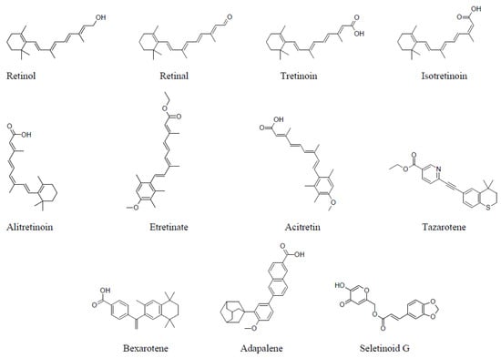 - Khalil, S.; Bardawil, T.; Stephan, C.; Darwiche, N.; Abbas, O.; Kibbi, A.-G.; Nemer, G.; Kurban, M. Retinoids: A journey from the molecular structures and mechanisms of action to clinical uses in dermatology and adverse effects. J. Dermatol. Treat. 2017, 28, 684–696. [Google Scholar] [CrossRef] [PubMed]