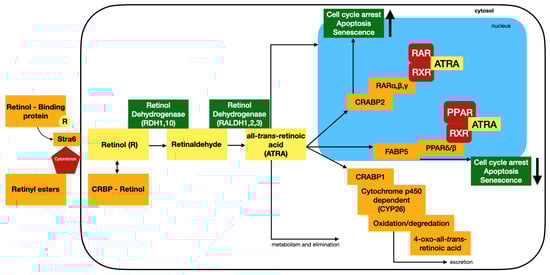 Animals cannot produce Vitamin A (retinol), so it must come from dietary sources. This can be achieved either by consuming provitamin A carotenoids found in plants, such as β-carotene, or by eating animal-based foods containing vitamin A. Once ingested, vitamin A is stored as retinyl esters in the liver until it is needed. When required, it is transported in the blood bound to retinol-binding protein (RBP) [41,42,43]. Retinol can be converted back and forth to retinal through oxidation by retinol dehydrogenases (RDH), and retinal can be further oxidized to ATRA by retinaldehyde dehydrogenases (RALDH) or cytochrome P450 enzymes in the liver [43,44,45].