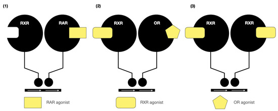 Multiple retinoid signaling pathways, based on Ref. [31]: retinoic acid receptor (RAR), retinoid X receptor (RXR), and other receptor (OR).