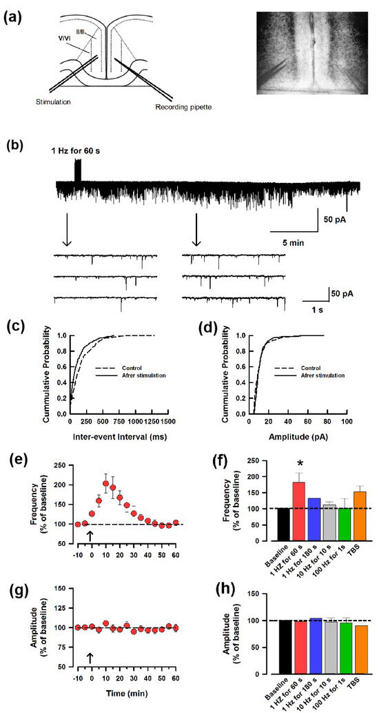 By using whole-cell patch-recording, we first applied low-frequency stimulation (LFS, 1 Hz for 60 s) in the left ACC and recorded the spontaneous excitatory postsynaptic current (sEPSC) of the right ACC neurons to test whether contralateral LFS could induce synaptic potentiation in the ipsilateral ACC neurons. The interpretation of sEPSC amplitude is complicated by the fact that these events represent a mixture of miniature and evoked (by spontaneous cell firing) synaptic currents. Early studies have proved that the frequency of the sEPSC represents the presynaptic release of the neurotransmitters [21]. We performed whole-cell patch-clamp recording here and patched the neurons at −70 mV; therefore, the increased frequency of the sEPSC indicates the enhanced probability of spontaneous glutamate release. Interestingly, contralateral LFS induced an increase in the frequency of the sEPSC (Figure 1a). Figure 1b demonstrates the effects of contralateral LFS on the cumulative distribution of the inter-event interval and amplitude of the sEPSCs. Contralateral LFS increased the proportion of sEPSCs having a shorter inter-event interval (p < 0.05) but did not change the amplitude (p < 0.05) when compared with that before the stimulation (same neuron as in Figure 1a). We found that contralateral LFS induced the synaptic potentiation of the frequency (Figure 1c,e), but not the amplitude of the sEPSCs (Figure 1d,g). This indicates that presynaptic glutamate release was enhanced by the LFS. Next, to observe whether a longer duration of the LFS or higher stimulation frequency had a similar effect, we used 1 Hz for 180 s, 10 Hz for 10 s, 100 Hz for 1 s, and theta burst stimulation (TBS) on the contralateral ACC. As shown in Figure 1f,h, only 1 Hz for 60 s stimulation induced potentiation significantly in the ACC, and none of the stimulation protocols above changed the amplitude.