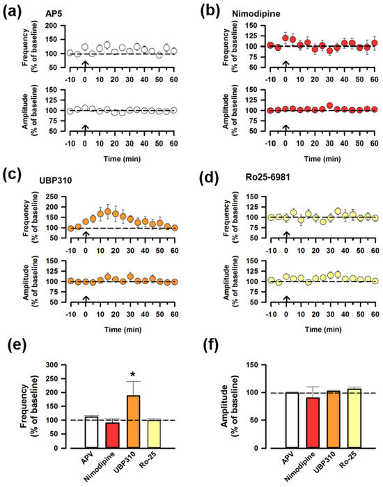 Previous studies found that the induction of LTP in the ACC requires NMDA receptors (NMDARs) and the L-type voltage-dependent Ca2+ channels (L-VDCCs) [1,22]. To investigate whether the synaptic potentiation of ACC-ACC requires the NMDARs, we applied an antagonist of NMDARs (AP-5, 50 μM) in the bath solution. The potentiation was blocked by the presence of AP-5 (Figure 3a), indicating that the synaptic potentiation of ACC-ACC is NMDAR-dependent. To further address the possible involvement of L-VDCC, we used an inhibitor of the L-VDCC (Nimodipine, 10 μM) and we found that Nimodipine also blocked the potentiation, indicating that L-VDCCs are important for ACC-ACC potentiation (Figure 3b). We also focused on kainate receptors (KARs), which play key roles in the presynaptic LTP in the ACC [5]. We applied a specific antagonist of the GluK1 receptor, UBP310 (10 μM), to the adult ACC slices, and we found that UBP310 did not affect the synaptic potentiation of ACC-ACC connection (Figure 3c). Furthermore, we investigated whether GluN2B subunit-containing NMDAR is required for the synaptic potentiation of ACC-ACC. We applied an antagonist of GluN2B-containing NMDAR, Ro 25-6981 (0.3 μM). Ro 25-6981 completely blocked ACC-ACC potentiation (Figure 3d). There were no significant changes among AP-5, nimodipine, and Ro 25-6981 (Figure 3e,f). These results suggest that the synaptic potentiation of ACC-ACC requires NMDAR, L-VDCC, and GluN2B.