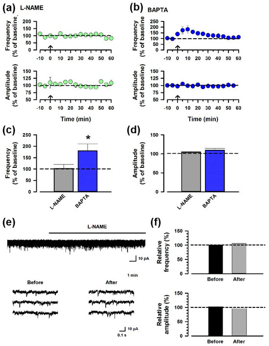 To assess the impact of NO on spontaneous excitatory synaptic transmission, we applied L-NAME (100 μM) to the bath solution. The application of L-NAME resulted in neither the frequency nor the amplitude of sEPSCs being affected (Figure 4e,f). This result suggests that NO does not affect basal transmission in the ACC.