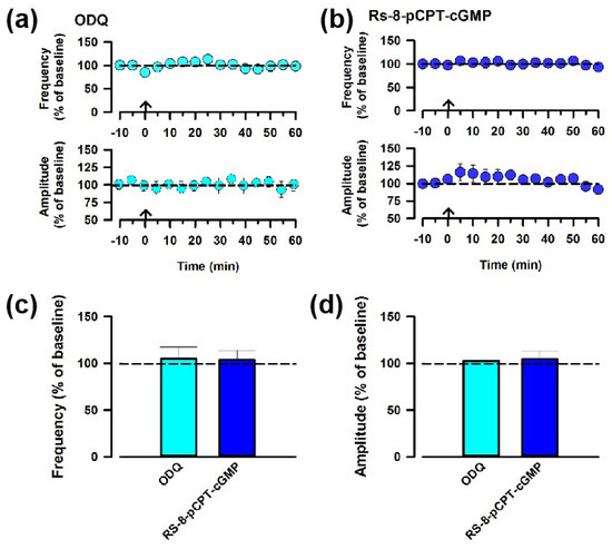 To further confirm the role of NO in ACC-ACC potentiation, we applied inhibitors downstream of the NO. The bath application of the inhibitor of the soluble guanylate cyclase (sGC), ODQ (10 μM), blocked potentiation in the ACC (Figure 5a,c). Next, we also applied an inhibitor for the protein kinase G (PKG), Rp-8-pCPT-cGMP (1 μM), to examine whether PKG activation is required for potentiation in the ACC. We found that Rp-8-pCPT-cGMP blocked ACC-ACC potentiation on the frequency of the sEPSCs (Figure 5b,c). These results suggest that the cGMP/PKG retrograde signaling pathway is critical for ACC-ACC potentiation.