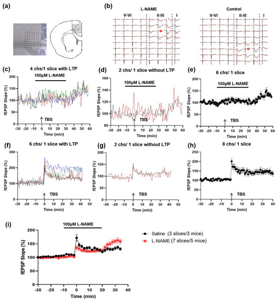 To further prove that NO-dependent synaptic potentiation is selectively dependent on the ACC-ACC connection, we also investigated the effect of NOS inhibition on the LTP induced by the local stimulation in the ACC. By using the multi-electrode recording system (MED64, Figure 6a), we found that TBS successfully induced homosynaptic LTP in four out of six activated channels in one ACC slice in the presence of L-NAME (Figure 6b–e). The slope of the TBS-induced LTP in the ACC reached a comparable level to the control group (Figure 6f–i). These data indicate that the homo-LTP in the ACC does not require NO.