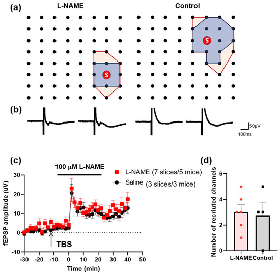 Previous studies found that TBS induced the recruitment of silent channels by using a MED64 recording system [23,24]. We further analyzed the effect of NO on the recruitment of silent channels. Recruited channels were found on the ACC slices after the TBS in the presence of L-NAME (Figure 7a,b). The number and the average amplitude of the recruited channels had no significant difference compared with those of the saline group (Figure 7c,d). These data indicate that the recruitment of silent responses does not require NO.