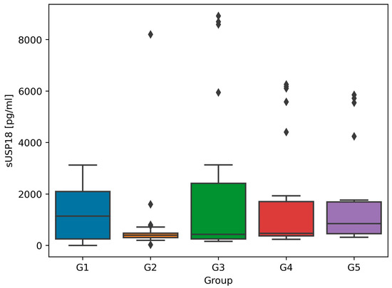 Median and interquartile ranges for serum ubiquitin-specific protease 18 (sUSP18) values in all study groups. The rhomboids represent outliers.