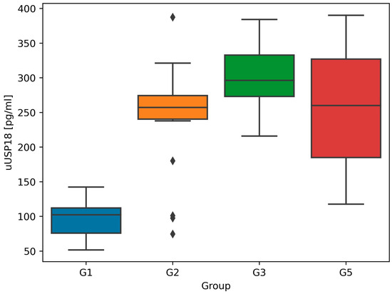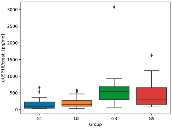 The highest uUSP18 concentration was found in G3—the group of patients with advanced CKD not yet on renal replacement therapy (303.3 pg/mL, IQR 283.6–346.0). Study participants with normal kidney function (eGFR ≥ 60 mL/min) were characterized by lower median uUSP18 values. In G2, it equaled 256.8 pg/mL (IQR 237.9–274.1) and, in G5, 259.9 pg/mL (185.0–327.0), respectively. The lowest uUSP18 was measured in healthy individuals of G1 and equaled 102.2 pg/mL (75.7–112.1) (Figure 2). The adjustment to urinary creatinine levels confirmed these differences (Figure 3).
