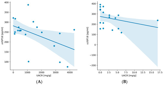 UACR is a parameter commonly used in everyday practice in assessing endothelial dysfunction [19,20]. UACR inversely correlated with uUSP18 in G2 (glomerulonephritis group, median UACR 960.6 mg/g, IQR 369.3–2238.1) (Figure 4A) and G5 (KTx group, median UACR 3.5 mg/g, IQR 1.3–5.3) (Figure 4B). Although the molecular weight of USP18 is lower than albumin (43 vs. 69 kDa) [1,2], the degree of their glomerular filtration is likely similar; hence, we hypothesize that markedly increased uUSP18 and uUSP18/creat. in patients with injured kidneys may result from an altered tubular handling which affects its final excretion. An additional investigation is required to identify variables that influence the glomerular filtration and tubular reabsorption of these proteins. The observation made in KTx patients is intriguing: sUSP18 is comparable to healthy controls, whereas the uUSP18 excretion remains high (which may suggest ongoing injury to renal tubules despite preserved GFR; Figure 1, Figure 2 and Figure 3). This observation may also point towards USP18 as a promising biomarker indicating renal (tubular) injury.