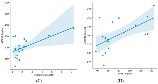 Spearman’s correlation analysis between uUSP18 and different parameters: (A) correlation between uUSP18 and urinary albumin-to-creatinine ratio (UACR) in group 2, (B) correlation between uUSP18 and UACR in group 5, (C) correlation between uUSP18 and creatinine in group 3, and (D) correlation between uUSP18 and urea in group 3. The blue lines illustrate the linear fit of data, the blue area represents the confidence interval.