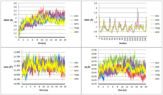 Parameter dependence diagrams: RMSD, RMSF, SASA, Rg for JW2, JW8, MTX, TMQ molecules, and apoenzyme on simulation time.