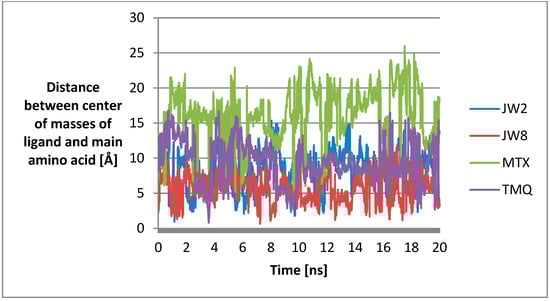 In addition, the stability of systems with benzamide ligands is revealed in the distances between the amino acid with which the most common hydrogen bonds are formed and the ligand (Figure 7). For JW8, it is the smallest, and for JW2, it is on par with TMQ and smaller than MTX. In addition, the changes in measured distances are more chaotic for MTX and TMQ compared to JW8 and JW2.