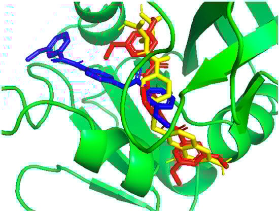 Structure of hDHFR with docked: JW2 (red), JW8 (blue), and MTX (yellow) with the lowest energies.