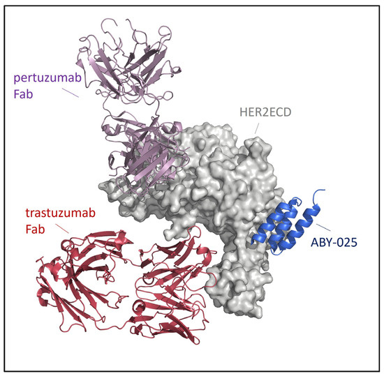 ABY-025 binds with picomolar affinity to the extracellular domain of HER2 (HER2ECD), an epitope distinct to the binding sites of therapeutic antibodies trastuzumab and pertuzumab. Fab: fragment antigen-binding region of a monoclonal antibody.