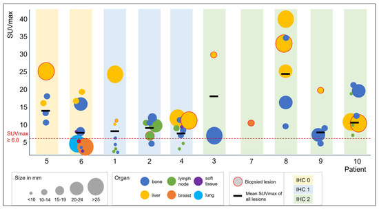 Results of [68Ga]Ga-ABY-025 PET/CT in 10 HER2-low breast cancer patients demonstrating disease heterogeneity. Bubbles represent standardized uptake values in single detected metastases; the different colors of the bubbles depict the location of the metastases in different organs, the relative size of the bubbles correlates to the actual size of the metastases, as explained in the figure legend. Per patient, the SUVmax of the lesion biopsied after HER2-PET imaging is indicated by a red circle around the colored bubble indicating the organ location of the biopsy. The colored bars (yellow, blue, and green) visualize the HER2 status of patients as assessed by biopsy prior to enrollment in the study. The mean SUVmax of all lesions is indicated by the thick black line. The SUVmax values of a maximum of three metastases per organ are shown. The data described in this figure was originally published in JNM by Altena et al. [58].