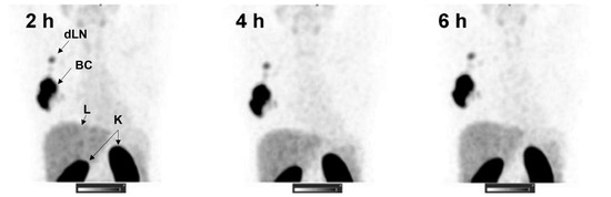 Representative SPECT images (MIP) at 2, 4, and 6 h after injection of [99mTc]Tc-ZHER2:4107 (Patient 16) visualizing the primary breast cancer (BC) and tumor-draining lymph node (dLN). Kidney (K) and liver (L) are the normal organs with the highest tracer uptake. The images taken at 2, 4, and 6 h after tracer injection (pi) demonstrate that imaging is possible as early as 2 h pi and that tracer uptake in the tumor is constant from 2 to 6 h. In the pictures, a reduction in tracer uptake can be seen in the area of the noninvolved breast, stomach, and lungs by 6 h after injection. Imaging was performed after injection of the optimal defined peptide mass of 1000 μg [99mTc]Tc-ZHER2:4107 that showed the best discrimination between HER2-positive and HER2-negative tumor lesions. Linear SUV scale from 0 to 15. Image adapted from [63]. Phase I clinical evaluation of 99mTc-labeled Affibody molecule for imaging HER2 expression in breast cancer. Image adapted from a study published in Theranostics by Bragina et al. [63].