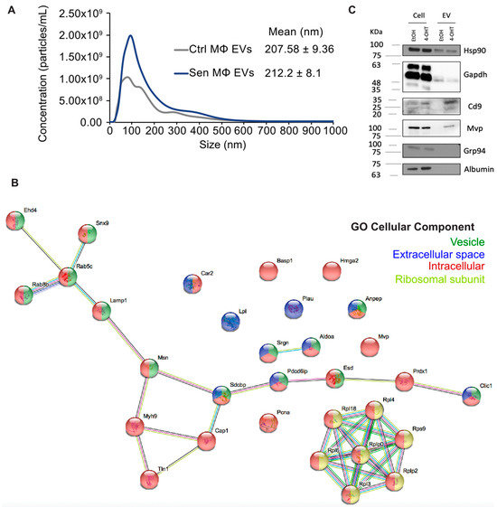 As growing evidence suggests that EVs are highly secreted by senescent cells, we investigated the EVs of Sen MΦ. Fluorescent Nanoparticle Tracking Analysis (fNTA) revealed that Sen MΦ secrete more EVs than Ctrl MΦ, although the size of EVs is similar in both conditions (Figure 3A). The proteome of EVs secreted by Ctrl and Sen MΦ was analyzed by Mass Spectrometry (MS). A total of 124 proteins were identified in all EVs, with a minimum of 10 exclusive spectrum counts. A gene ontology (GO) analysis of these proteins highlighted GO terms referring to EVs and exosomes. Of these 124 proteins, 29 were enriched, and 2 were depleted in EVs from Sen MΦ compared to those of Ctrl MΦ (Figure S3A,B and Figure 3B). As expected, some proteins enriched in EVs from Sen MΦ were associated with the GO term vesicle. However, more than half of the enriched proteins in Sen MΦ EVs were labeled as intracellular and/or ribosomal subunits, suggesting a senescence-specific targeting of some proteins to EVs (Figure 3B). Moreover, many proteins enriched in the EVs of Sen MΦ are positive regulators of assembly and secretion of exosomes, suggesting they could be responsible for the abundant EV secretion of Sen MΦ (Figure S3C,D). We validated by immunoblots the increase of both Cd9 and Mvp in EVs from Sen MΦ. The endoplasmic reticulum marker Grp94 and BAS were absent in the EVs preparation, showing the lack of cellular or media contaminants (Figure 3C).