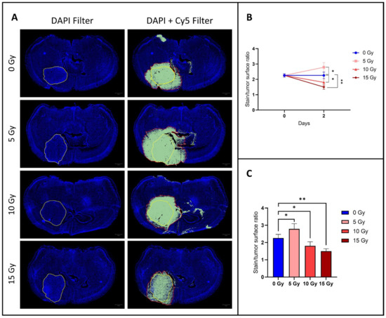 3.1. The Diffusion of EB Dye Outside the Tumor Area Increased after 5 Gy, but Decreased at 10 and 15 Gy