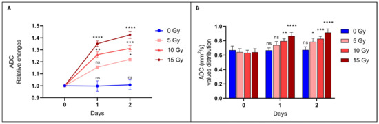 ADC measured by diffusion-MRI. Relative changes in ADC (A) and ADC values (B) between the control group (blue) and groups irradiated with 5 Gy (light red), 10 Gy (middle red), and 15 Gy (dark red). Diffusion-MRI acquisition was performed just before irradiation (day 0) and 24 h (day 1) and 48 h (day 2) after irradiation. On day 1, there was a significant increase in groups irradiated with 10 Gy (n = 4) and 15 Gy (n = 4) compared to the control group (n = 5). On day 2, there was a significant increase in the group irradiated with 5 Gy (n = 4) and an even more significant increase than on day 1 for groups irradiated with 10 Gy and 15 Gy. The higher the dose of irradiation used and the further in time after irradiation, the greater significant increase in ADC compared to the control group. The results are expressed as means ± SD. ns, non-significant, * p-values < 0.05, ** p < 0.01, *** p < 0.001, **** p < 0.0001.
