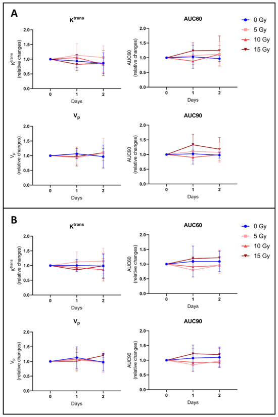 Hemodynamic parameters measured by DCE-MRI computed with Patlak pharmacokinetic model. Relative changes in tumor hemodynamic parameters between the control group (blue), 5 Gy treated group (light red), 10 Gy treated group (middle red), and 15 Gy treated group (dark red) computed with Patlak model using ROI T1 (A) corresponding to the whole tumor area and using ROI Delta (B) corresponding to the margin tumor area. DCE-MRI acquisition was performed just before irradiation (day 0) and 24 h (day 1) and 48 h (day 2) after irradiation. There was no significant difference in the tumor hemodynamic parameters between the control group (n = 5) and groups receiving 5 Gy (n = 4), 10 Gy (n = 4), or 15 Gy (n = 4), whatever the studied parameter and ROI. The results are expressed as means ± SD.