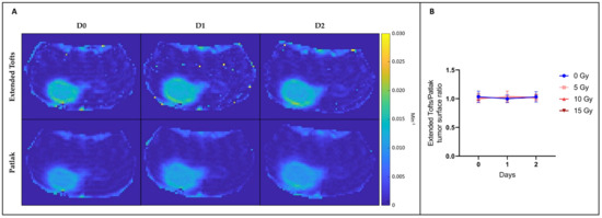 We also compared the Ktrans parametric maps between those computed using the extended Tofts model and those computed using the Patlak model (Figure 7). We calculated the ratio between the tumor surface measured on the Ktrans map from the extended Tofts model and the tumor surface measured on the Ktrans map from the Patlak model. We observed that this ratio was very close to 1, whatever the irradiation dose used or the day after irradiation. There was therefore no significant difference between tumor surface areas measured on Ktrans maps obtained with the extended Tofts model and those obtained with the Patlak model.