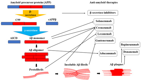 In addition to its implications in AD’s pathophysiology, the focus on Aβ is also relevant from a therapeutical point of view, as the amyloidogenic hypothesis has long been a prolific source for developing targeted therapies [16,17]. However, most anti-Aβ treatments were unsuccessful in clinical trials and never became available for daily clinical use [18]. Several possible explanations are considered: the unilateral focus of medication ignoring many relevant aspects of AD, the incomplete knowledge of the mechanisms involved in AD onset and evolution, or the insufficient monitoring of patients receiving experimental therapies [19]. Still, anti-Aβ drugs are a promising therapeutic avenue among the limited options of AD treatments, with proof being the fact that the Food and Drug Administration (FDA) recently approved Aβ-directed monoclonal antibodies, Aducanumab, although not without controversies [20], and Lecanemab [21].