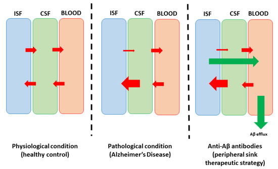The “peripheral sink therapeutic strategy” explaining anti-Aβ antibody mechanisms of action. Abbreviations: ISF—interstitial fluid. CSF—cerebrospinal fluid. Red arrows—bidirectional flow of Aβ between the central and peripheral sinks. Green arrow—therapy-induced Aβ efflux (designed by modifying a figure from Schreiner et al. [39]).