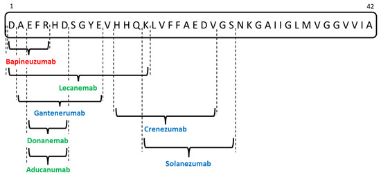 Overview of the anti-Aβ monoclonal antibodies targeting different epitopes of the Aβ42 peptide (red—first-generation medication; blue—second-generation drugs; green—third-generation drugs).