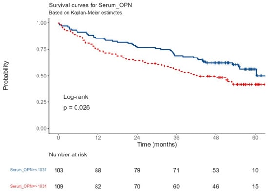 After performing an ROC curve analysis, we estimated that the cutoff point with the highest sensitivity and specificity was 1.03 ng/mL. Using this threshold to obtain a dichotomous variable, we found statistically significant differences in 1-, 3-, and 5-year survival. The 1-, 3-, and 5-year survival for patients with OPN ≥ 1.03 ng/mL was 75.2% (67.6–83.8%), 55.9% (47.3–66%), and 41.6% (32.9–52.6%), while it was 85.4% (78.9–92.5%), 68.9% (60.6–78.5%), and 56.23% (46.6–67.9%) for patients with OPN < 1.03 ng/mL (Figure 1).