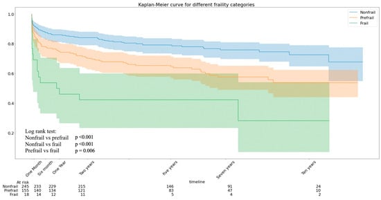 The median survival time was 1987 days (IQR: 1487) for all patients. The survival rates were 0.73, 0.54, and 0.28 for nonfrail, prefrail, and frail patients, respectively. The Kaplan–Meier curve for frailty categories is shown in Figure 1. The log-rank value was p < 0.001. The starting point of the Kaplan–Meier curve was the day of OHT.