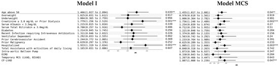 Cox proportional hazards model results for the components of the frailty screening tool for all-cause mortality, with and without the inclusion of mechanical cardiac support. C-index of the original model (Model I): 0.67, c-index of the model with the addition of mechanical cardiac support devices (Model MCS): 0.68. BIVAD: biventricular assist device; CF-LVAD: continuous-flow left ventricular device; ECMO: extracorporeal membrane oxygenation; LVAD: temporary left ventricular assist device; MCS: mechanical cardiac support; Temporary MCS: temporary mechanical cardiac support. The threshold of 0.05 was selected for significance, ** and *** show the level of significance (**: 0.05; ***: 0.01).