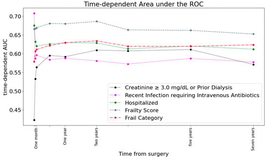 The impact of the individual components of the OHT frailty screening tool and MCS had different contributions over time. The plot of cross-validated unadjusted areas under the time-dependent receiver operating characteristic curves for top-performing frailty component predictions is shown in Figure 3.