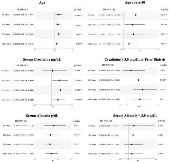 Multivariable time-dependent Cox hazard models showed that using a continuous age variable in place of a binarized variable slightly increased the performance of the model. Binarized creatinine level or dialysis yielded a better c-index at all times over the continuous variable. The albumin level showed better performance as a continuous variable (Figure 4).