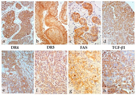 Immunohistochemical expression of death receptors DR4, DR5, and FAS and TGF-β1 in infiltrative pT1 (a–d) and muscle-invasive pT2 urothelial bladder cancer (e–h). High immunohistochemical expression of markers is shown (400×).