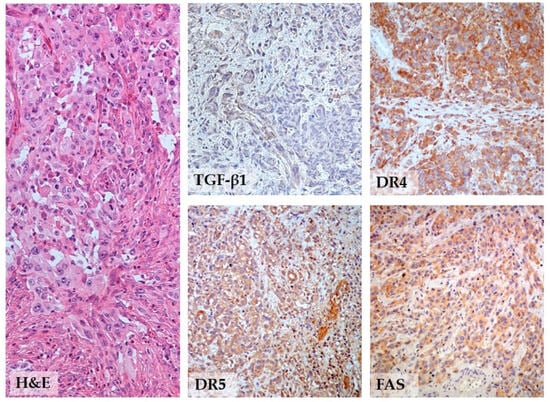 Immunohistochemical analysis was performed using the primary antibodies to DR4 (rabbit polyclonal antibody to DR4 at dilution of 1:100, ab8414, Abcam, Cambridge, UK), DR5 (rabbit polyclonal antibody to DR5 at dilution of 1:200, ab8416, Abcam, Cambridge, UK), FAS (mouse monoclonal antibody to FAS at dilution of 1:100, Santa Cruz Biotechnology, Santa Cruz, CA, USA), and TGF-β1 (mouse monoclonal antibody at dilution of 1:40, clone TGFB17, Leica Biosystems, Newcastle, UK). The analysis and interpretation of immunohistochemical stains were performed on the light microscope (Olympus BX43, Olympus Corporation, Tokyo, Japan) and digital photographs that were acquired using the imaging system (Olympus cellSens platform standard, Olympus Corporation, Tokyo, Japan). For each core tumor sample, the percentage of stained tumor cells was calculated. Staining intensity was graded using a scale of 0 to 3 (0, no staining; 1, weak; 2, moderate; and 3, intense). For the purposes of statistical analysis, the immunoexpression status of the examined markers was dichotomized into high expression and low expression, which included absent staining or expression under the designated threshold. Death receptor expression (DR4, DR5, and FAS) was considered high if at least ≥25% of tumor cells showed positive expression of moderate or strong brown color intensity. The immunoexpression of TGF-β1 was recorded as high if at least 50% of cancer cells were stained with intermediate or strong intensity.
