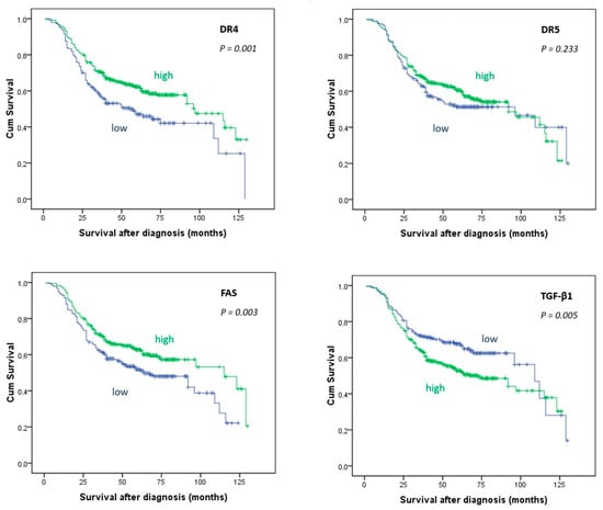 Survival analyses showed that high expression of death receptors DR4 and FAS was significantly linked to better prognosis of the UBC patients (p = 0.001 and p = 0.003, respectively). Inversely, high TGF-β1 expression was significantly associated with worse overall survival (p = 0.005) (Figure 3). Expression of DR5 did not show a significant association with patients’ overall survival (p = 0.233). Immunohistochemical expression of TGF-β1, as well as high death receptors (DR4, DR5, and FAS), did not show a significant correlation with recurrence-free survival (p = 0.866, p = 0.535, p = 0.149, and p = 0.585, respectively).