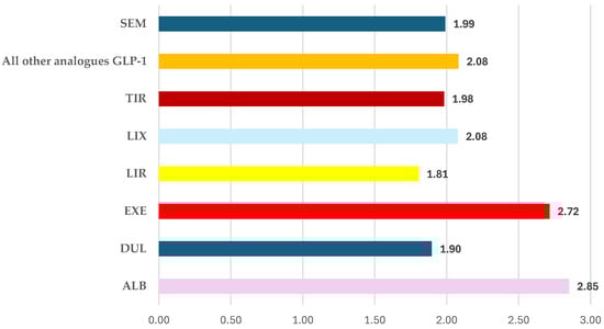The proportion of ADRs reported from total cases treated with SEM (1.99) is less than for the group of all other GLP-1 RAs (2.08). Also, higher proportions were observed for ALB (2.85), EXE (2.72), and LIX (2.08). Conversely, for LIR and DUL, other very prevalent GLP-1 RAs, the proportion of ADRs from the total ICSRs was lower (1.81, respectively 1.90). However, for TIR the proportion (1.98) was similar to SEM (Figure 5).