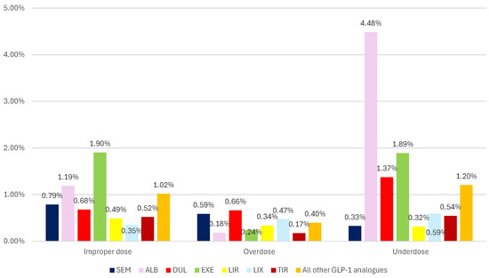 Figure 7 presents the frequency of ADRs related to dosage in GLP-1 RAs class. Thus, for SEM, the most frequent are ADRs related to improper dose (0.79%), a percentage higher than that of DUL (0.68%), TIR (0.52%), and LIR (0.49%), but lower than that of EXE (1.90%), and the entire group of all other analogues (1.02%). Overdoses have been reported for SEM (0.59%) with a lower frequency than for DUL (0.66%), but higher than those reported for all other comparators. Underdoses have the lowest frequency (0.33%) in HLTs related to the dosage of SEM. This percentage is similar to LIR (0.32%) and inferior to all other comparators.