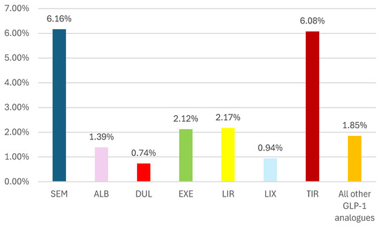 The proportion of ADRs reported from the total ICSRs. ALB—albiglutide; DUL—dulaglutide; EXE—exenatide; LIR—liraglutide; LIX—lixisenatide; SEM—semaglutide; TIR—tirzepatide.