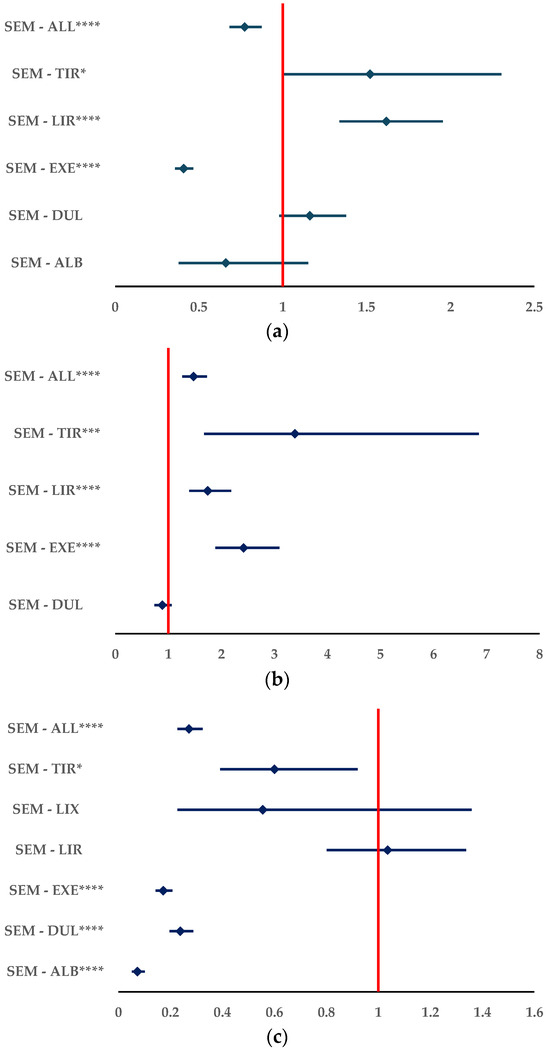 Disproportionality analysis for incorrect dosage of SEM: (a) improper dosage; (b) overdose; (c) underdose. ALB—albiglutide; DUL—dulaglutide; EXE—exenatide; LIR—liraglutide; LIX—lixisenatide; SEM—semaglutide; TIR—tirzepatide. * p <0.05; *** p ≤ 0.001; **** p ≤ 0.0001.